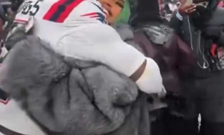 Cardi B joined Stefon Diggs on the field following the Patriots’ Super Bowl–clinching win, marking the moment in a custom gray leather ensemble by Sir Babajagne. The fitted look featured a corseted bodice, sculpted seams, and a streamlined skirt, creating a sharp, architectural silhouette.