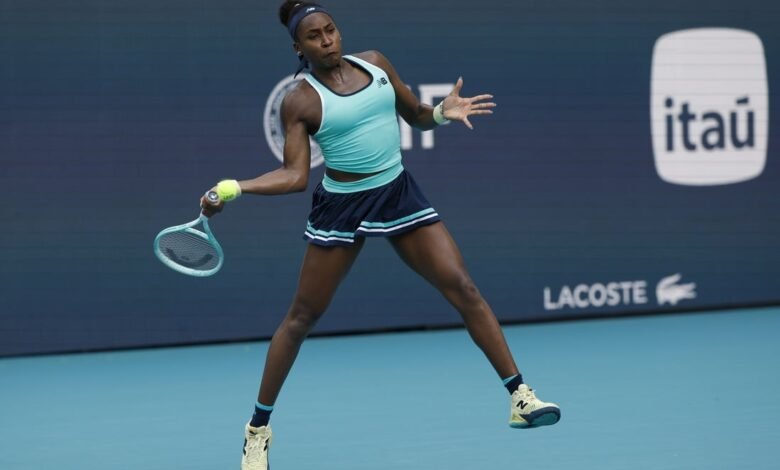 Mar 24, 2025; Miami, FL, USA; Coco Gauff (USA) hits a forehand against Magna Linette (POL)(not pictured) on day seven of the Miami Open at Hard Rock Stadium. Mandatory Credit: Geoff Burke-Imagn Images Coco Gauff sailed through the final four games of the second set to defeat fellow American Jessica Pegula 6-4, 7-5 and capture the Wuhan Open on Sunday in China.