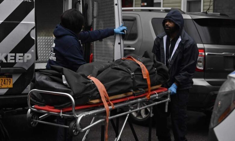 FILE – A Medical Examiner crew removes a dead body.
