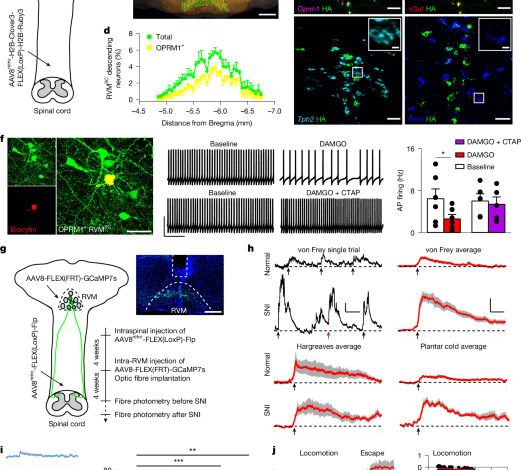 Mice were deeply anaesthetized with pentobarbital sodium solution and transcardially perfused with PBS, followed by 4% PFA in 1× PBS at room temperature. Brains and spinal cords were dissected from perfused mice and post-fixed in 4% PFA in 1× PBS at 4 °C overnight, cryoprotected in 30% sucrose in 1× PBS at 4 °C overnight, embedded in OCT compound, frozen using dry ice and kept at –80 °C. Brains and spinal cords were cryosectioned (14 μm for RNAscope in situ hybridization or 50 μm for immunostaining) using a cryostat (Leica). For immunostaining, 50-μm sections were washed three times for 5 min each with 1× PBS. They were then incubated in a blocking solutions (0.3% PBST containing 10% normal donkey serum (LAMPIRE Biological Products 7332100)) for two hours at room temperature. Subsequently, the sections were incubated with primary antibodies diluted in 0.3% PBST containing 3% normal donkey serum overnight at 4 °C. After three 10-min washes with PBS, the sections were incubated with secondary antibodies diluted in 0.3% PBST containing 5% normal donkey serum for two hours at room temperature. After this, the sections were washed three times for 10 min each with PBS; Hoechst 33342 solution (Thermo Fisher Scientific) was included in the second wash at a 1:10,000 dilution. Finally, the sections were mounted with Fluoromount-G (Southern Biotech). The primary antibodies used in this study included rabbit anti-mCherry (1:1,000, 600401397, Rockland), rabbit anti-FOS (1:1,000, 226003, Synaptic Systems), goat anti-TPH2 (1:500, ab121013, Abcam) and mouse anti-HA (1:1,000, 901514, Biolegend). Secondary antibodies included Alexa-594- or 647-conjugated donkey anti-rabbit antibodies, Alexa-647-conjugated donkey anti-mouse antibodies and Alexa-647-conjugated anti-goat antibodies. All secondary antibodies were purchased from Life Technologies and used at a 1:1,000 dilution. For RNAscope in situ hybridization, 14-μm sections were collected on glass slide and mRNA transcripts were detected using the RNAscope Fluorescent Multiplex Assay (Advanced Cell Diagnostics) and RNAscope Fluorescent Multiplex Reagent Kit v2 (323100). The RNAscope catalogue probes were used to detect Oprm1 (493251), vGat (319191), vGlut2 (319171), Tph2 (318691) and Penk (318761) RNA molecules. Images were obtained using a ZEISS 710 confocal microscope using either 10× (Plan-Apochromat 10×, NA 0.45) or 20× (Plan-Apochromat 20×, NA 0.8) objectives. For imaging large sections of spinal cord and brain, the tile-scan function was used and the tile images were stitched using ZEISS Zen microscope software.