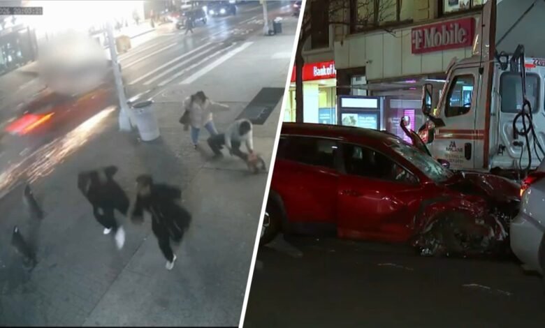 The vehicle can be seen on the video zooming down West 125th Street just after 8 p.m. Thursday night, speeding past other cars and barreling through the bike lane. The driver then struck the two bicyclists in a collision that was so violent, one of the workers went flying in the air.