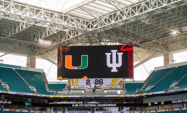 The scorebaord inside the stadium before the College Football Playoff National Championship college football game at Hard Rock Stadium in Miami Gardens on Monday, Jan. 19, 2026, Monday night’s title game between Miami and Indiana will be the most expensive ticket in the history of the College Football Playoff.