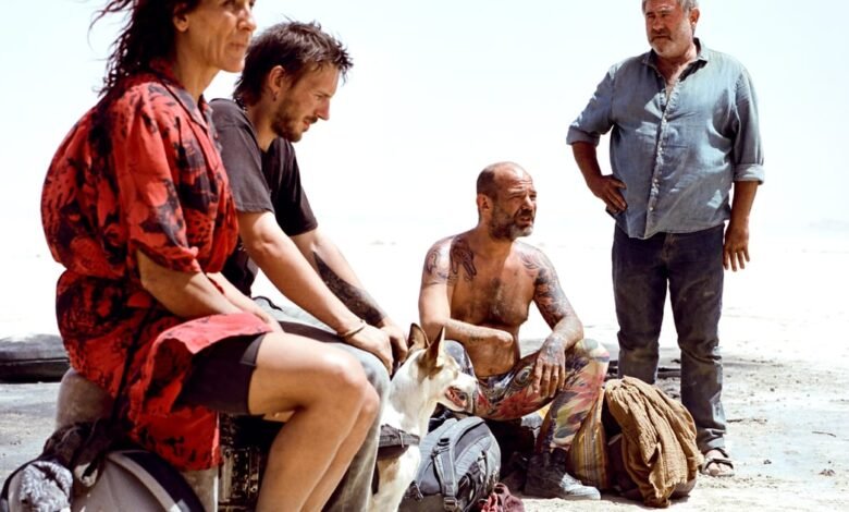 Enter ambling, worried father Luis (Sergi López) and his pre-teen son Esteban (Bruno Núñez), handing out flyers for their missing daughter/​sister, who left six months ago and was said to be at a desert rave like this one. They try not to harsh the other ravers’ mellow, but are ultimately futile in their search. But they do meet Stephy (Stefania Gadda), Josh (Joshua Liam Herderson), Tonin (Tonin Janvier), Jade (Jade Oukid) and Bigui (Richard Bellamy), who mention they’re going to be driving down to another rave in Mauritania, and so they follow the gang on their long road trip in a dinky people carrier.